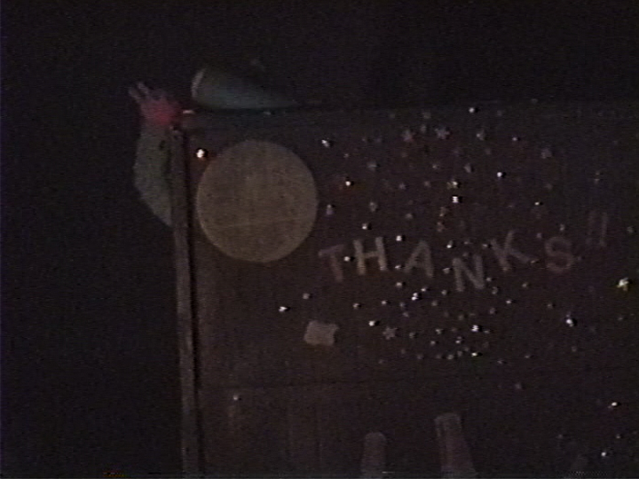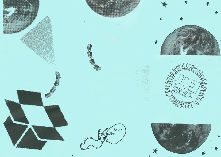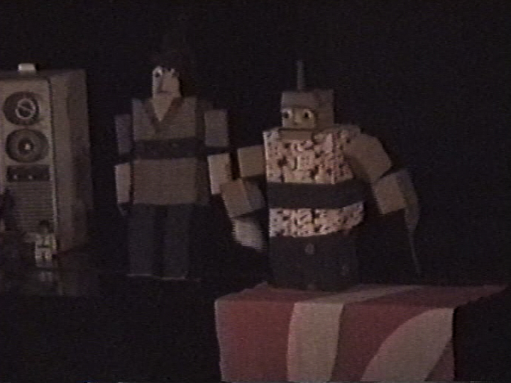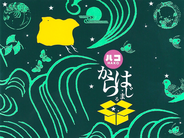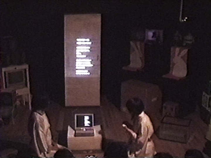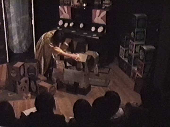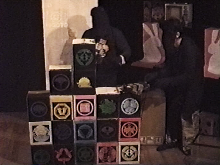 シルクスクリーン作家:田川辰平が段ボール箱に手で刷った大量の箱や、同じく田川作の冷蔵庫なる箱、他には便器、水が落ちる空中の蛇口など、物体が空間を埋め尽くす。